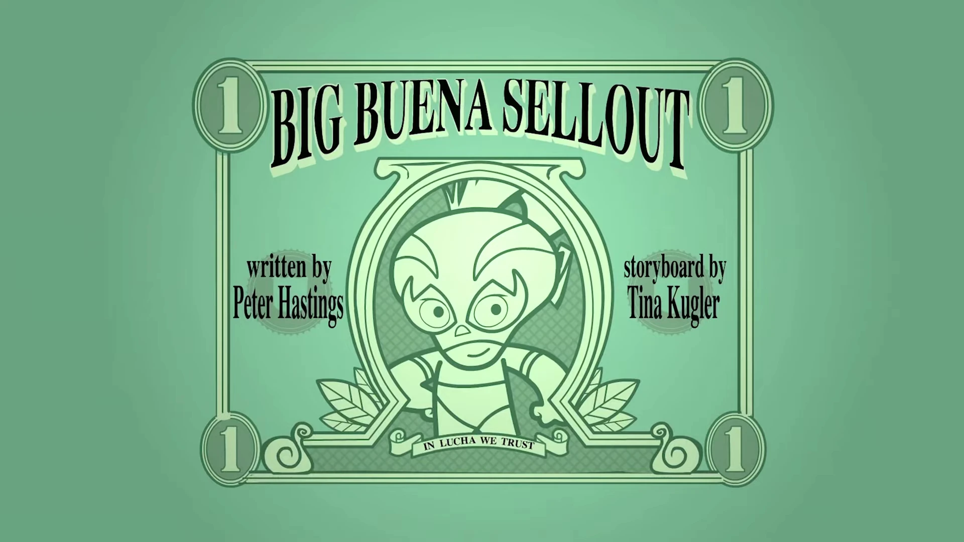 - The background of a closing credits with screenshots taken from each respective episode are replaced with a tile of masks from Rikochet, Buena Girl, and The Flea in a purple background.